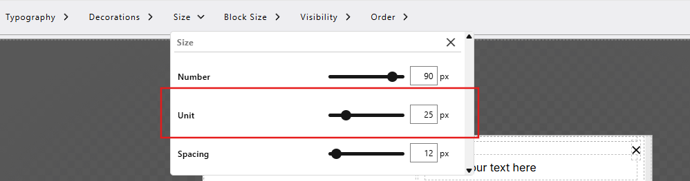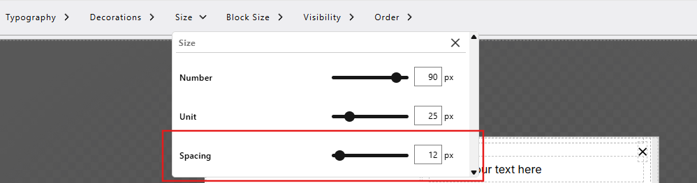 The Size settings appear when you add a Counter Block to your popup. These controls allow you to adjust the appearance and layout of the counter by defining its dimensions, spacing, and visual balance within the design.
