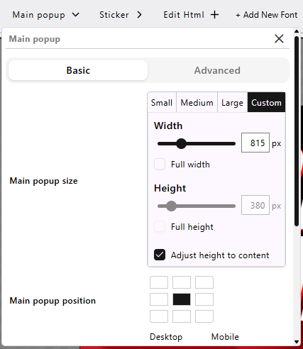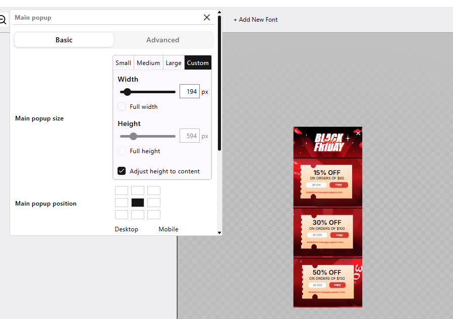 - Reduce font sizes, spacing, and adjust popup dimensions under Main Popup Settings.