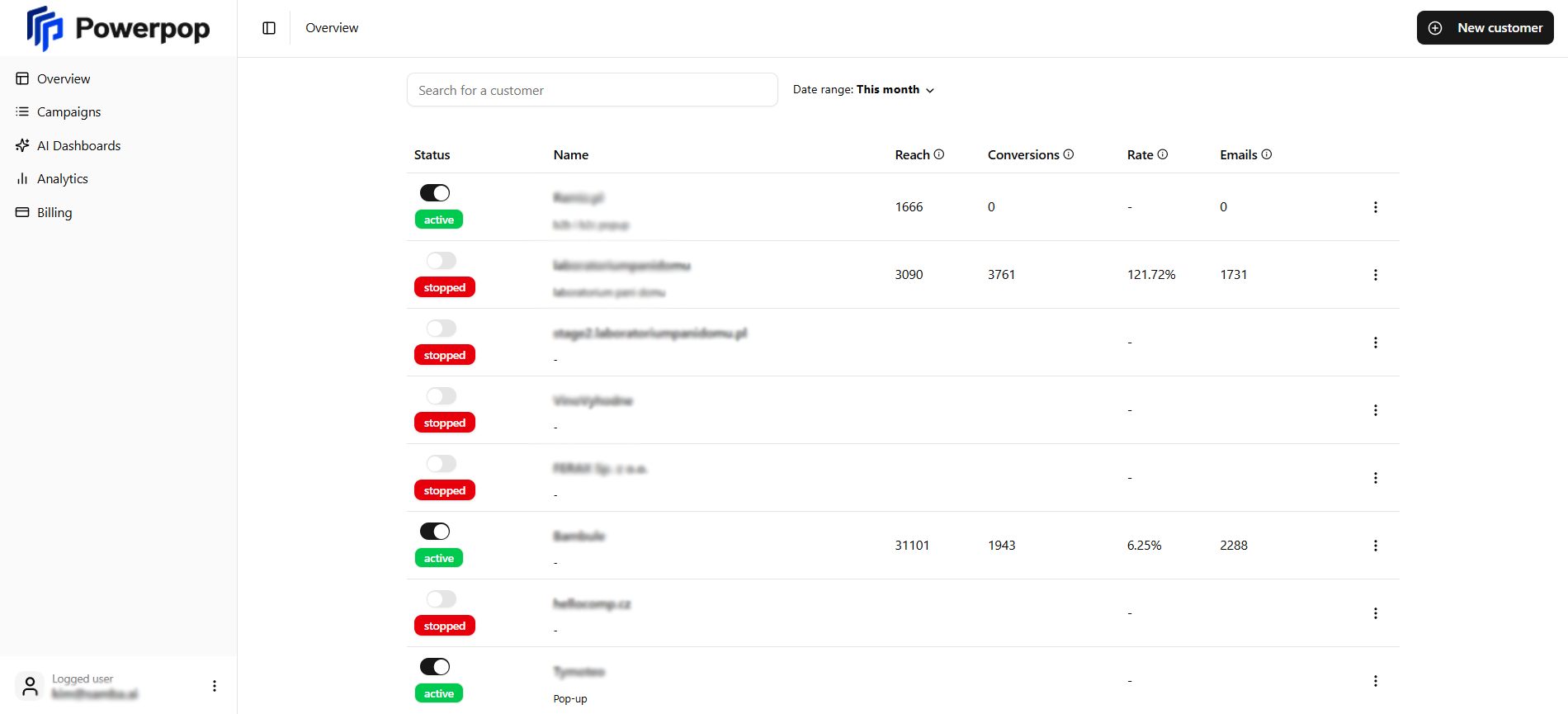 The Overview section is the starting point of your Powerpop experience. It provides a simple dashboard where you can manage your assigned customers and easily navigate to other parts of the platform.