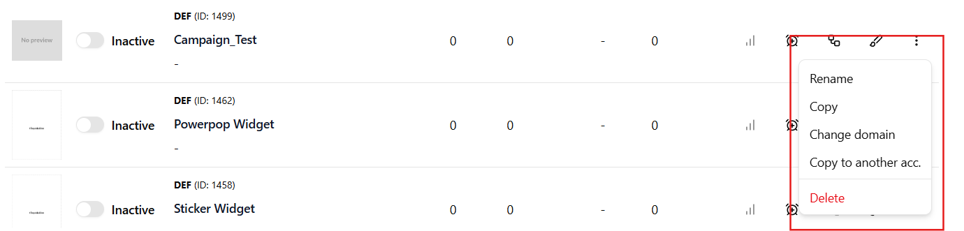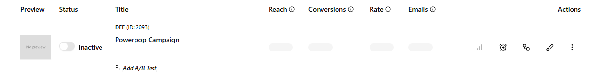 - Status - A toggle showing if the campaign is currently Active (live on your site) or Inactive.