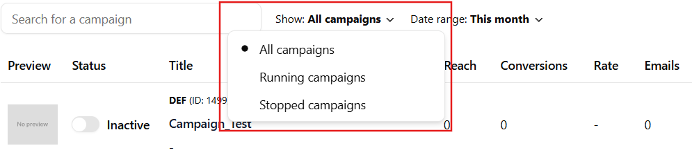 - Show - Filter the list to show all campaigns, running campaigns, or only stopped ones.