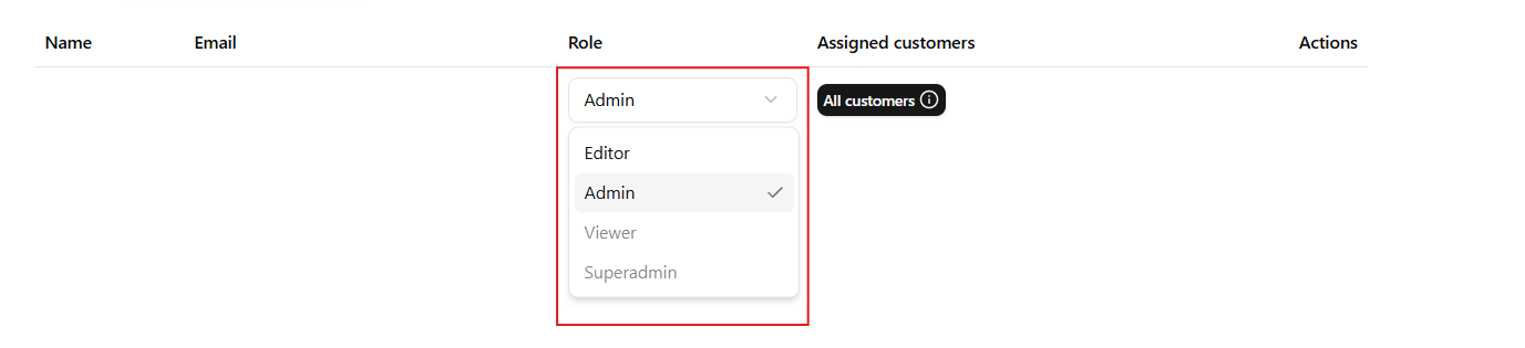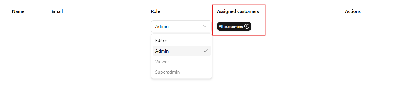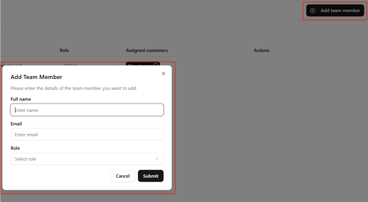 You’ll see a list of existing team members with their Name, Email, Role, and Assigned Customers.