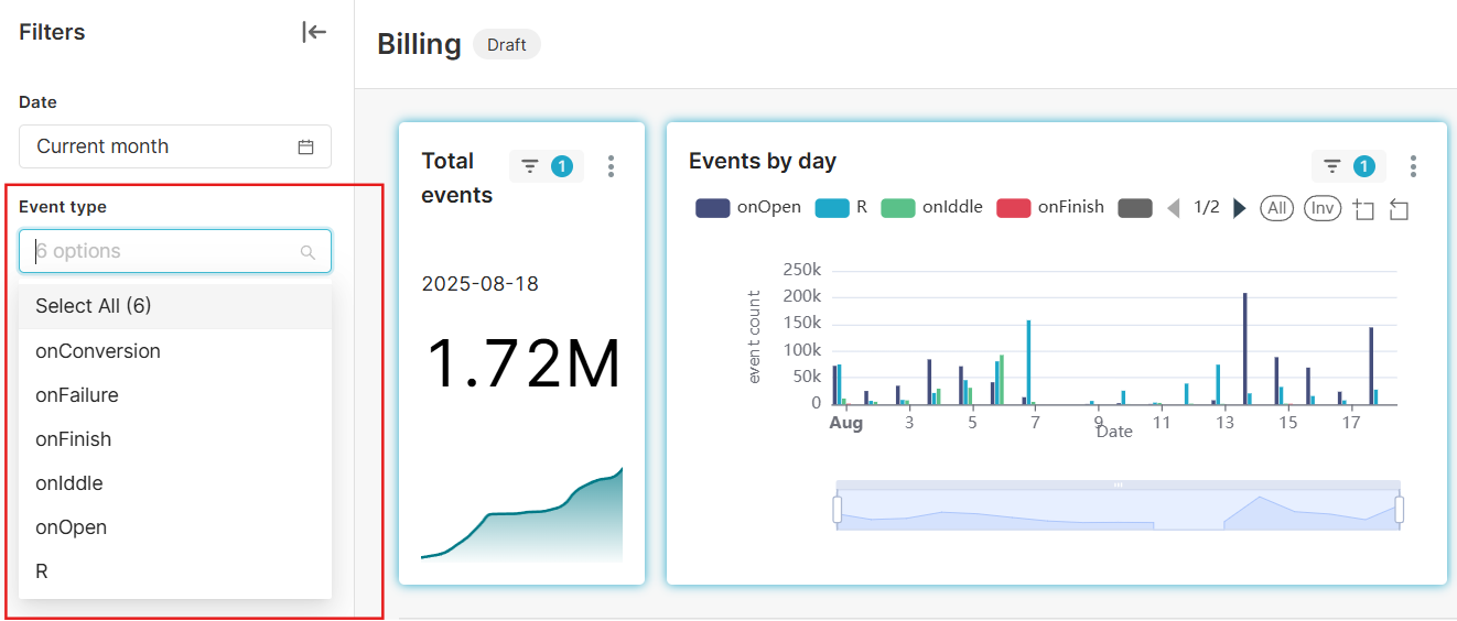 - Definition: Shows the total number of billing-related events recorded within the selected timeframe.