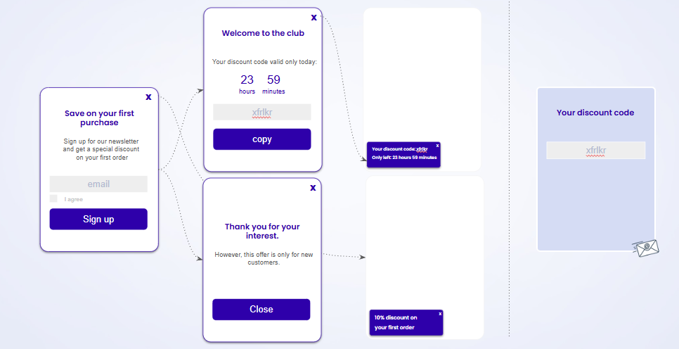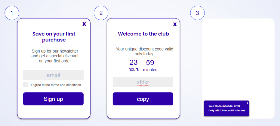 - After entering their email address, it is verified, and if it is not registered, a unique discount code is displayed directly in the pop-up.