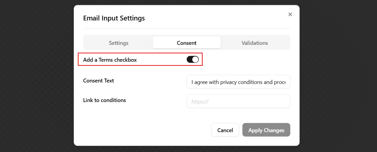 - Add a Terms Checkbox – Enable this to add a consent checkbox under the email field.