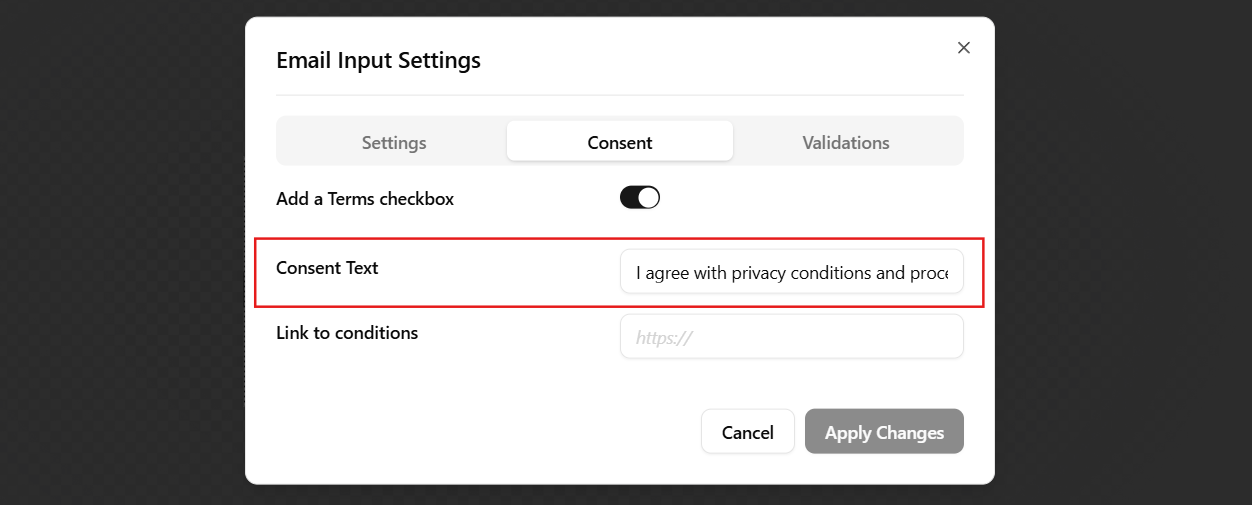 - Link to Conditions – Add a URL link to your privacy policy or terms page.