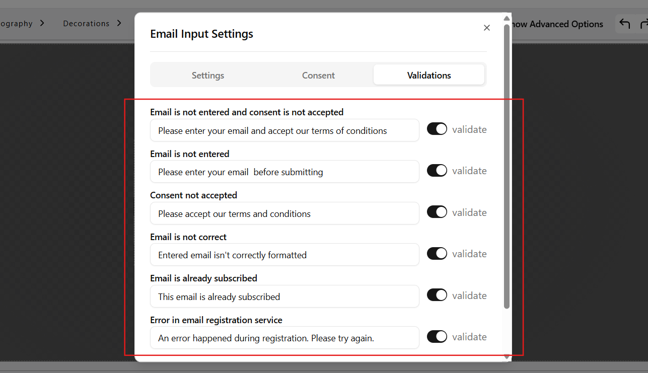 The Email Input Settings panel gives you complete control over how visitors enter and submit their emails. You can adjust how it looks, define what happens after submission, and ensure users meet all required conditions before subscribing—helping you create a smooth and compliant signup experience.