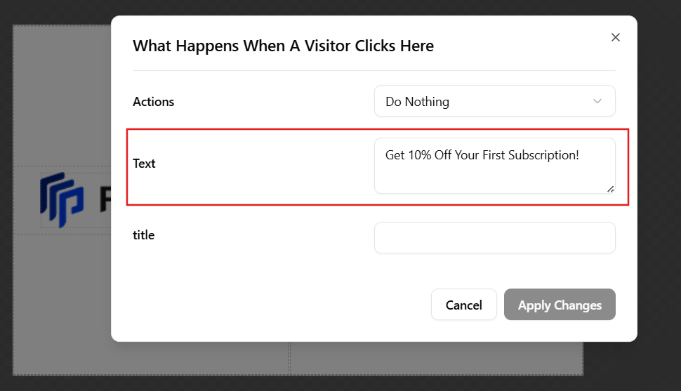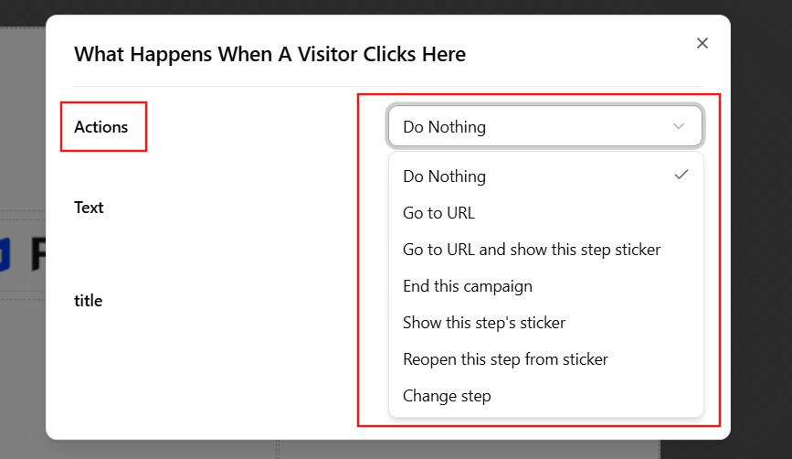 The Editor Content Text settings define what happens when a visitor clicks a specific element within your popup — such as a button, image, or text link. This helps you guide user interaction and define the next step in your campaign flow.