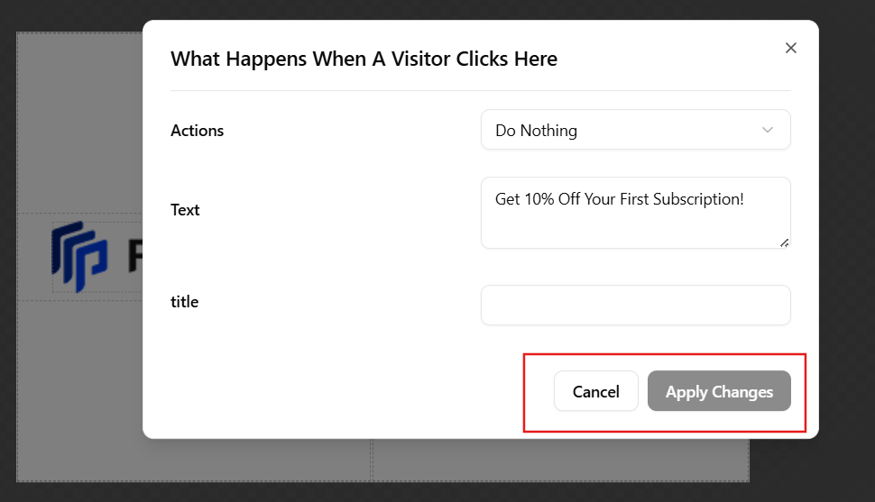 When you select a clickable element in the editor and open its settings, a dialog appears titled “What Happens When A Visitor Clicks Here.”